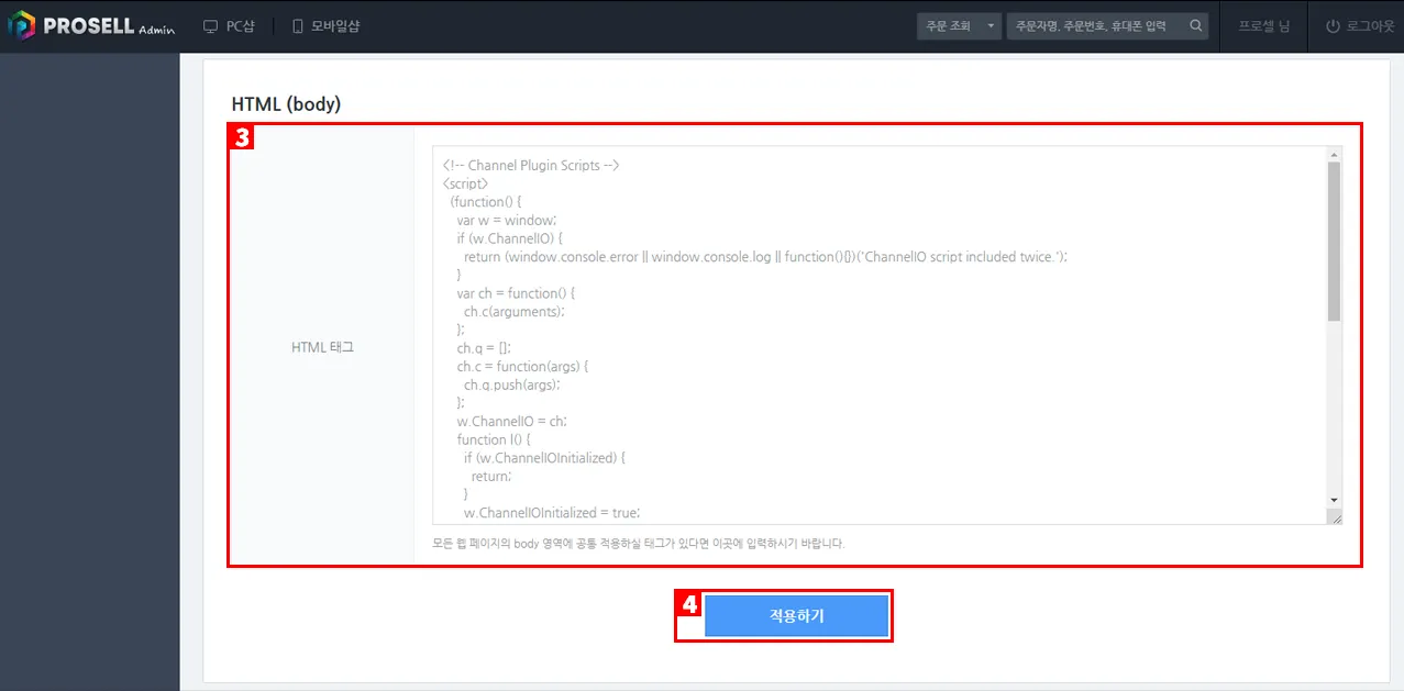 ③ 프로셀 관리자 페이지의 쇼핑몰 설정 > 외부연동 설정 > 웹마스터 도구 > HTML (Body) 부분에