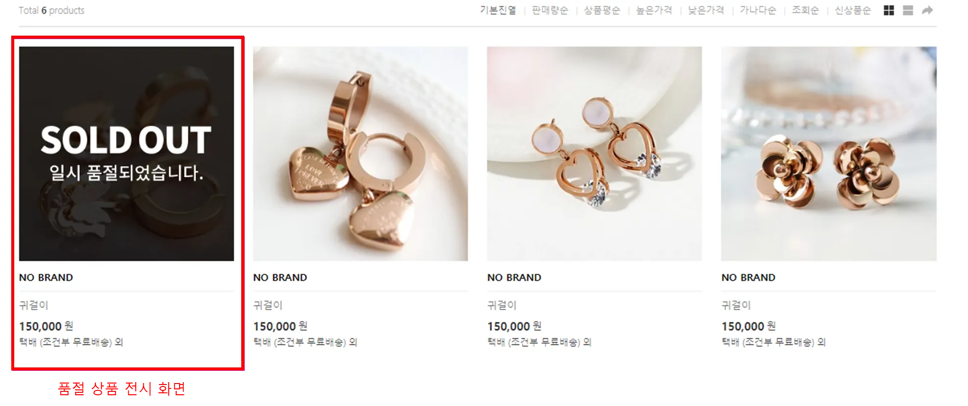 품절 상품을 쇼핑몰에 전시하면 ‘일시 품절’ 상태로 노출됩니다. (수정 불가)