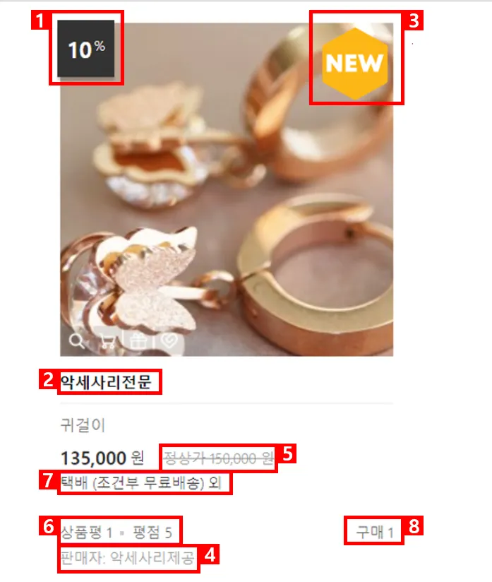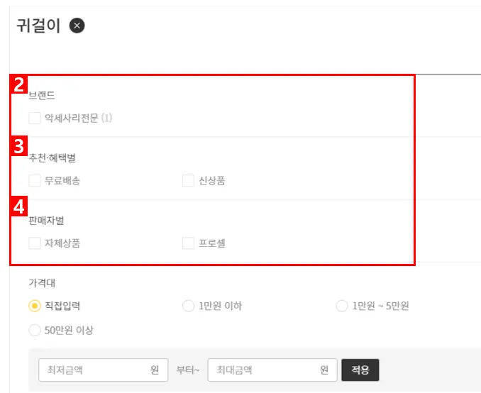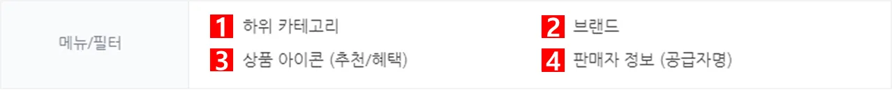 브랜드, 상품 아이콘, 판매자 정보는 필터 기능으로, 선택한 필터 정보에 맞는 상품을 분류하여 노출합니다.