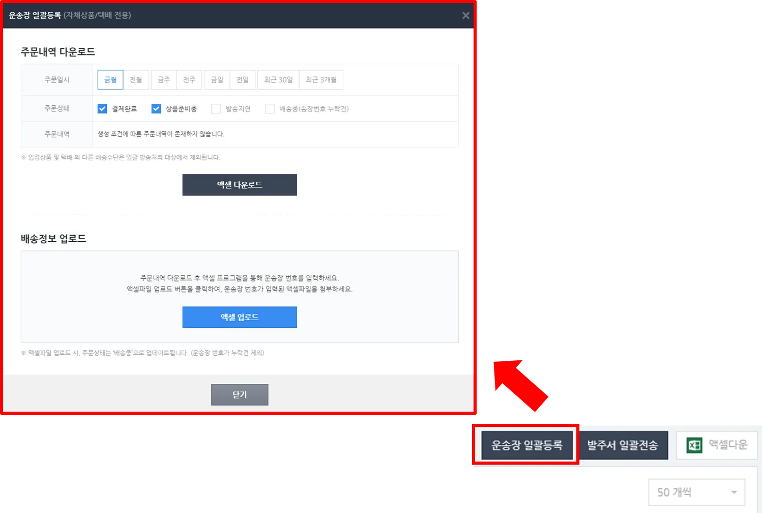 ‘목록 결과’에 검색된 전체 주문서를 다운로드 합니다.