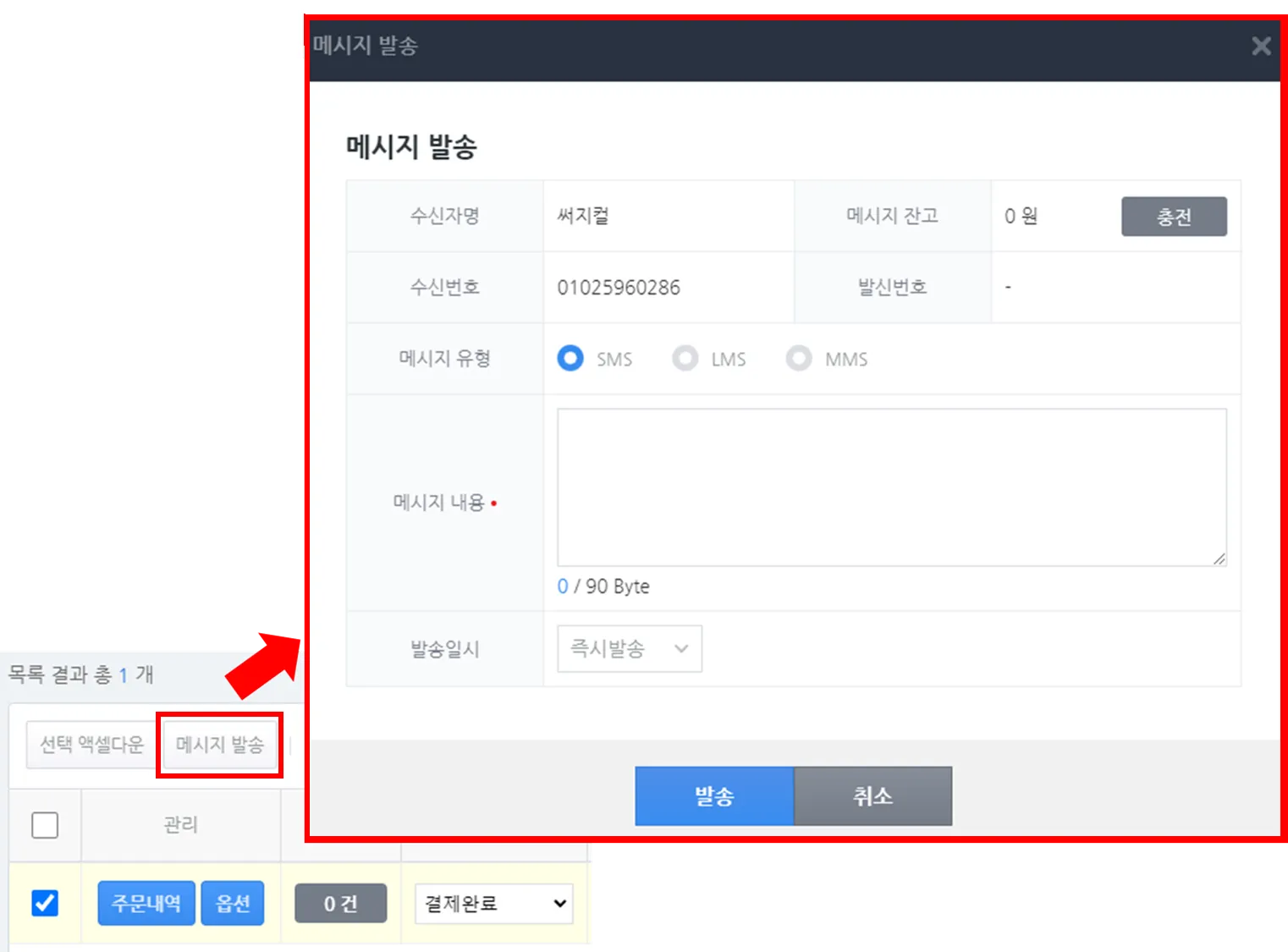2) 메세지 발송 : 검색된 주문서 중 원하는 주문서를 선택해 문자 메세지를 발송할 수 있습니다.