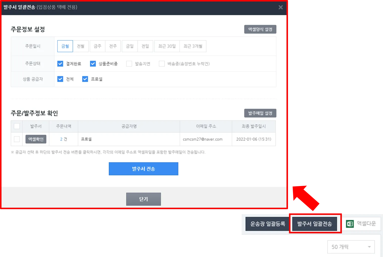 5) 발주서 일괄전송 : 주문서를 선택해 공급자에게 발주서를 일괄로 전송할 수 있습니다.