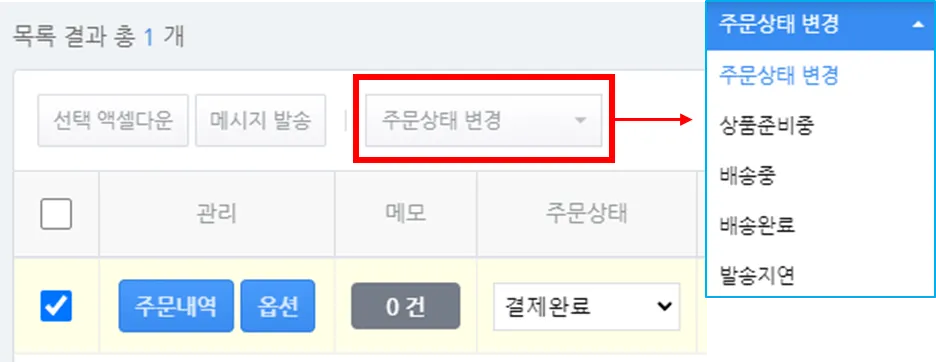 3) 주문상태 변경 : 검색된 주문서를 선택해 주문 상태를 일괄로 변경할 수 있습니다.