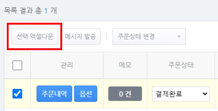 1) 선택 엑셀다운 : 검색된 주문서 중 원하는 주문서를 선택해 엑셀로 다운 받을 수 있습니다.