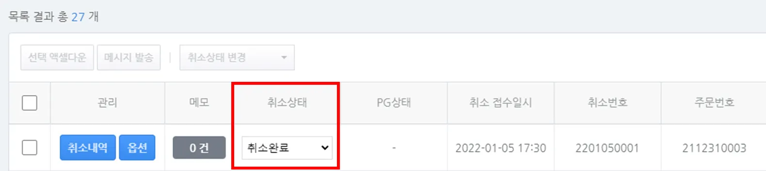관리자는 주문서의 ‘취소상태’를 확인할 수 있으며, 상태 값을 변경할 수 있습니다.