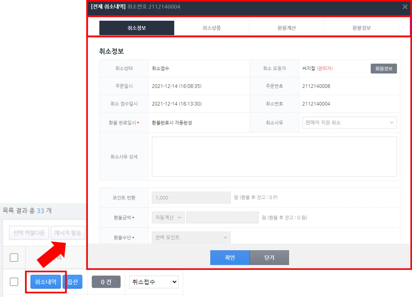 2) 주문서의 ‘취소내역’ 버튼을 클릭하면 취소 상세정보 팝업을 확인할 수 있습니다.