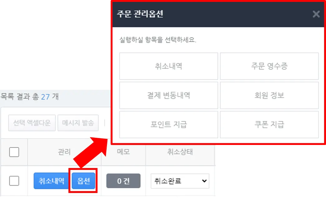 ‘취소내역’, ‘주문영수증’, ‘결제 변동내역’, ‘회원 정보’, ‘포인트 지급’, ‘쿠폰 지급’ 기능을 제공합니다.
