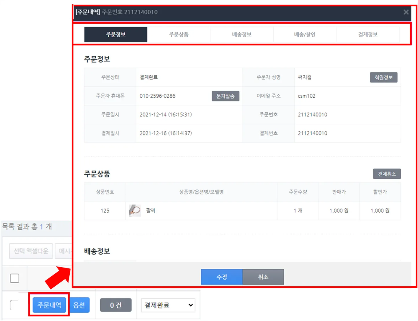 2) 주문서의 '주문내역' 버튼을 클릭하면 '주문 상세정보'를 확인할 수 있습니다.