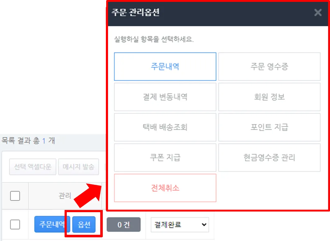 ‘주문내역’, ‘주문 영수증’, ‘결제 변동내역’, ‘회원정보’, ‘택배 배송조회’, ‘포인트 지급’, ‘쿠폰 지급’, ‘현금영수증 관리’, ‘전체취소’ 기능이 제공되며, 주문상태에 따라 ‘전체반품’, ‘부분반품’, ‘직권교환’ 기능이 추가로 제공됩니다.