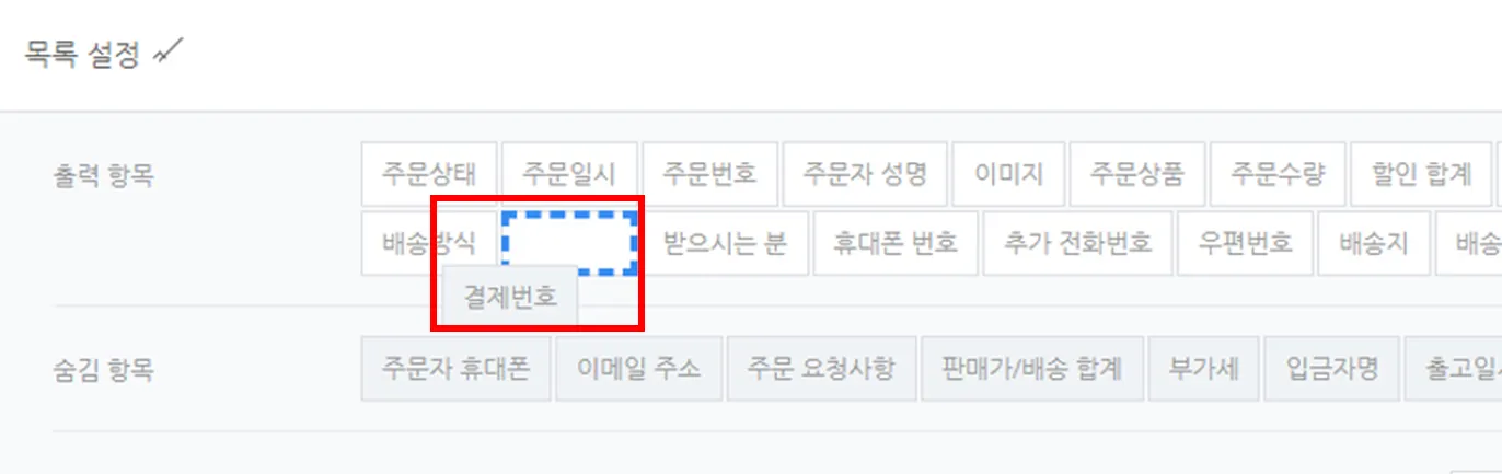 각각의 항목을 마우스로 끌어 출력을 원하는 항목과 원하지 않는 항목을 분류하고 항목이 노출되는 순서를 조정할 수 있습니다.