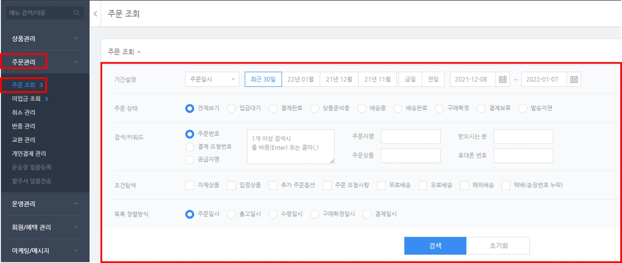 기간설정, 주문상태, 검색/키워드, 조건탐색 , 목록 정렬방식 중 원하는 조건을 선택하여 상품을 검색합니다.