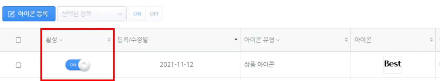 활성 버튼을 클릭하여 아이콘 노출 값을 ON/OFF 상태로 수정 할 수 있습니다.