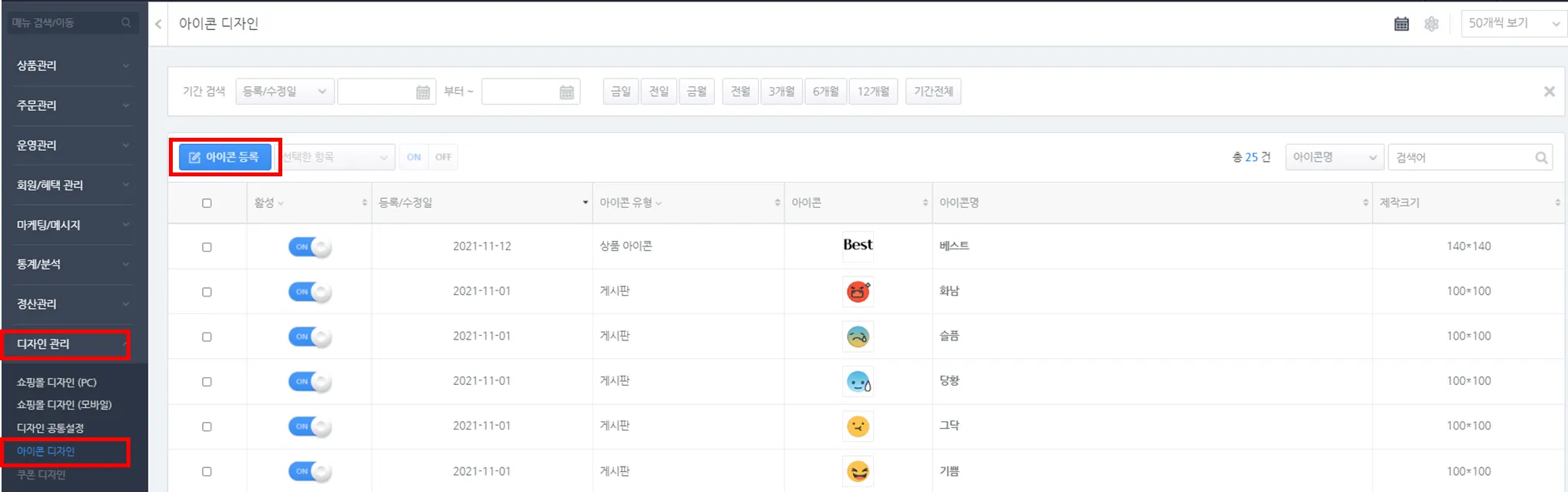 1) [디자인 관리 > 아이콘 디자인] 메뉴에서 ‘아이콘 등록’ 버튼을 클릭하면 새로운 아이콘을 등록할 수 있습니다.