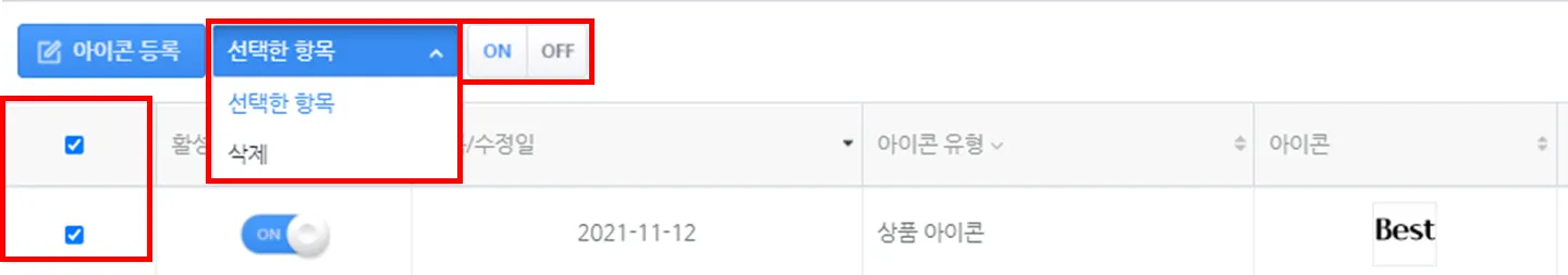 3) 다수의 아이콘을 선택하여 상태 값을 ON/OFF 상태로 수정하거나 아이콘을 삭제할 수 있습니다.