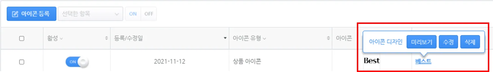 1) 등록된 아이콘의 ‘아이콘명’을 클릭하면 ‘미리보기’,’수정’,’삭제’ 가 가능합니다.