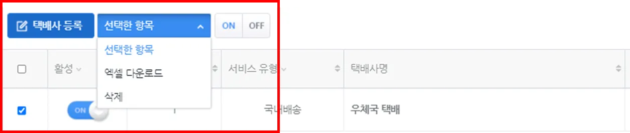 2) 택배사별 체크박스를 선택 후 삭제, ON/OFF, 상태로 일괄 변경 및 엑셀 다운로드가 가능합니다.