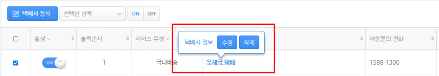 1) 등록된 택배사는 ON/OFF 기능으로 미노출이 가능합니다.