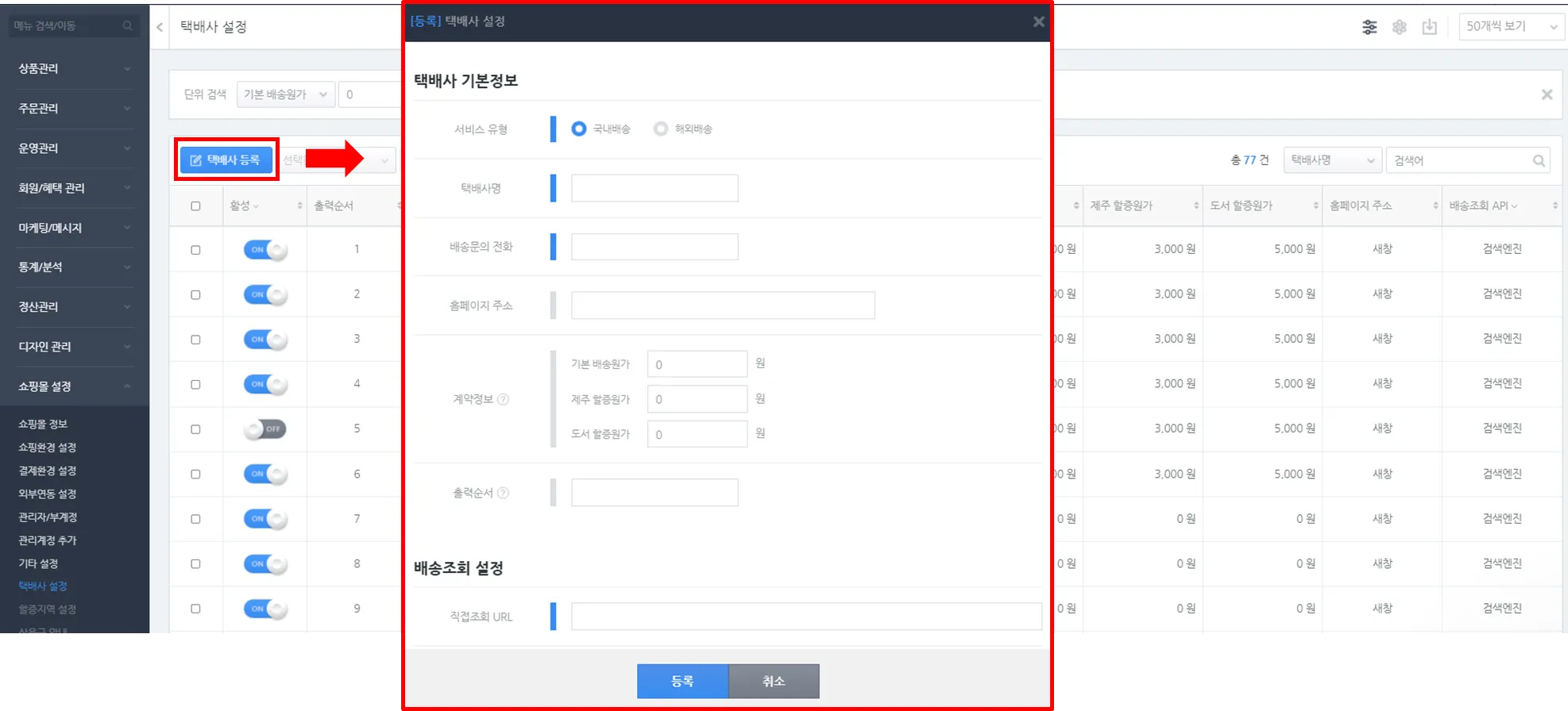 1) [쇼핑몰 설정 > 택배사 설정] 메뉴에서 ‘택배사 등록’ 버튼을 클릭하면 새로운 택배사를 등록할 수 있습니다.