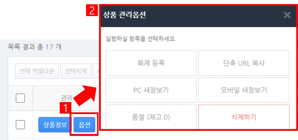 2) '옵션' 버튼을 클릭하면 '상품 관리옵션' 메뉴가 팝업되며, 관련 기능을 사용할 수 있습니다.