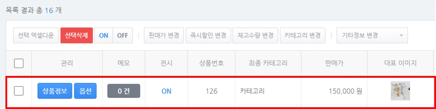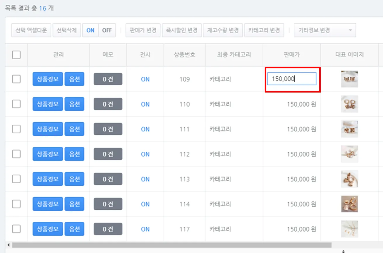 1) 수정할 상품을 선택하여 상품정보를 일괄로 수정할 수 있습니다.