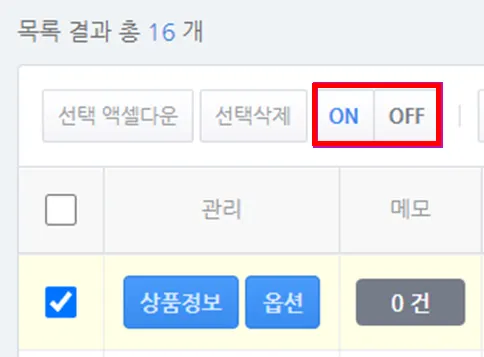 검색된 상품 중 원하는 상품을 선택해 쇼핑몰 노출 여부를 설정할 수 있습니다.