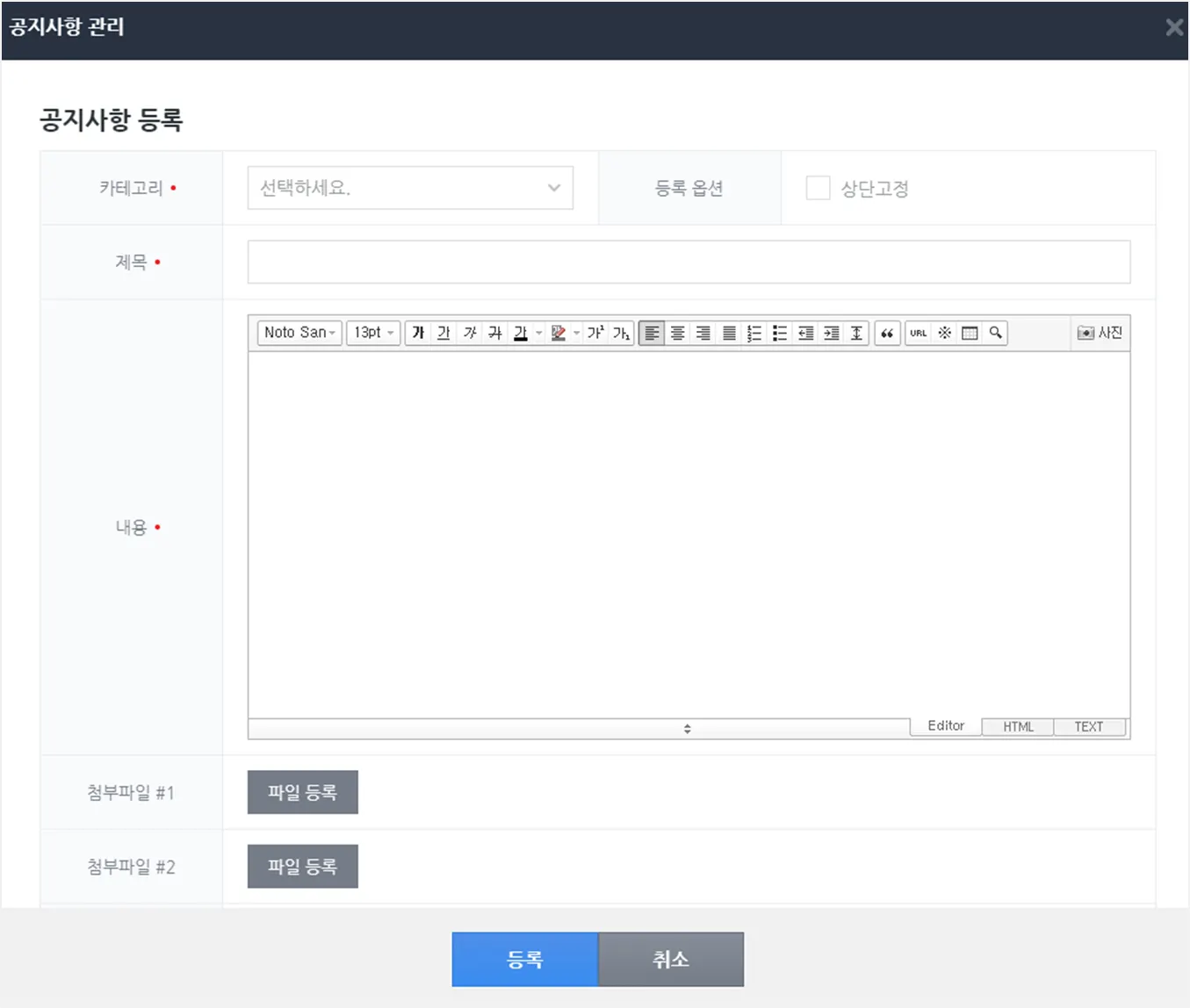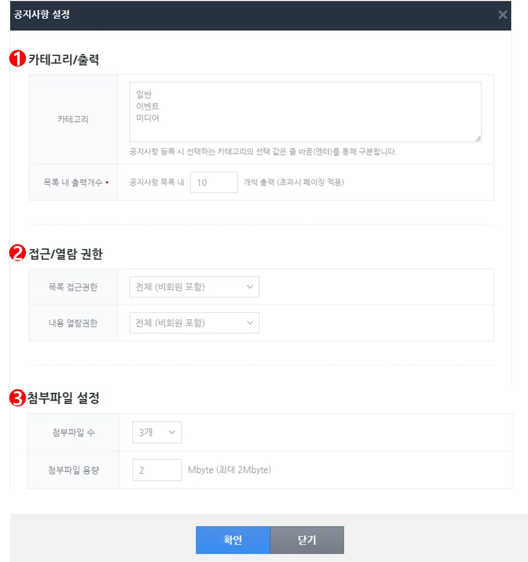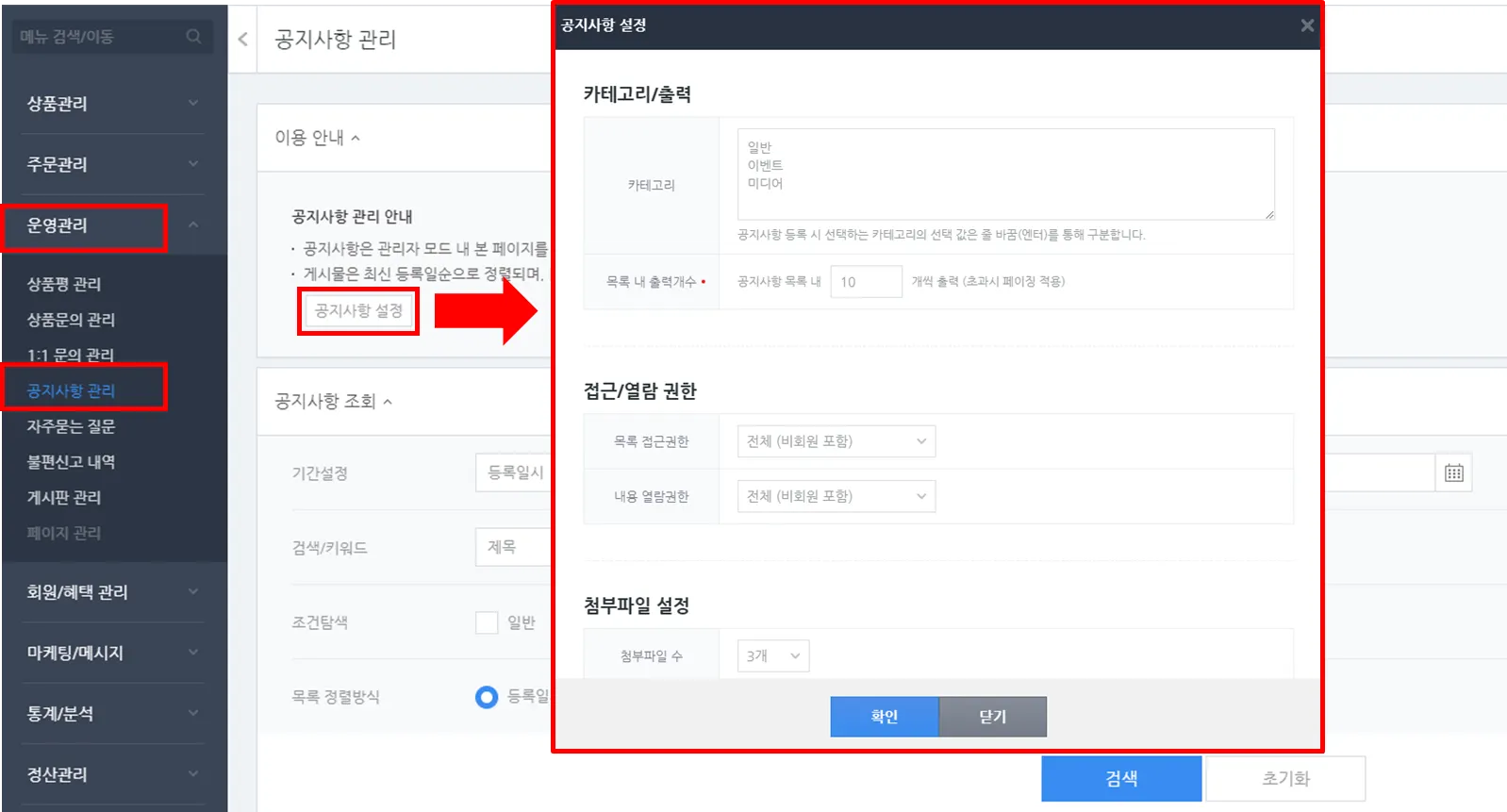 ※ 공지사항 관련 기능 설정 및 관리 메뉴입니다.