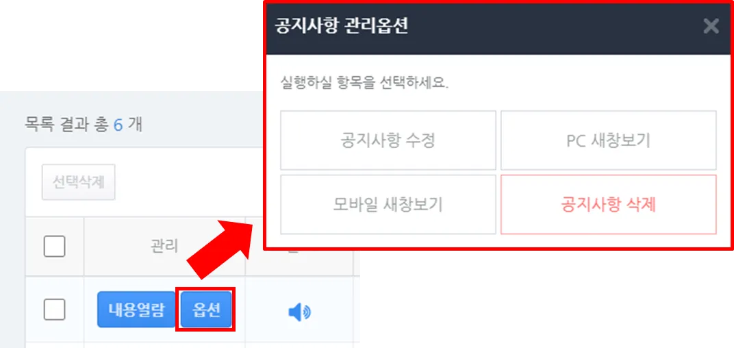 2) 공지사항 글의 ‘옵션’ 버튼을 클릭하면 ‘공지사항 관리옵션’ 기능을 사용할 수 있습니다