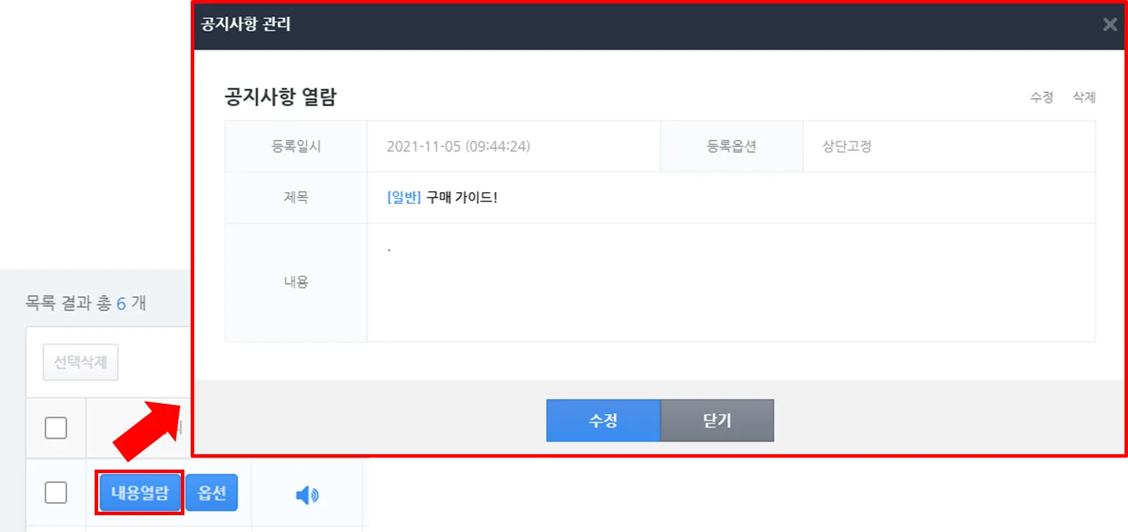1) 공지사항 글에 ‘내용열람’ 버튼을 클릭하면 ‘공지사항 관리’ 팝업을 확인할 수 있습니다.