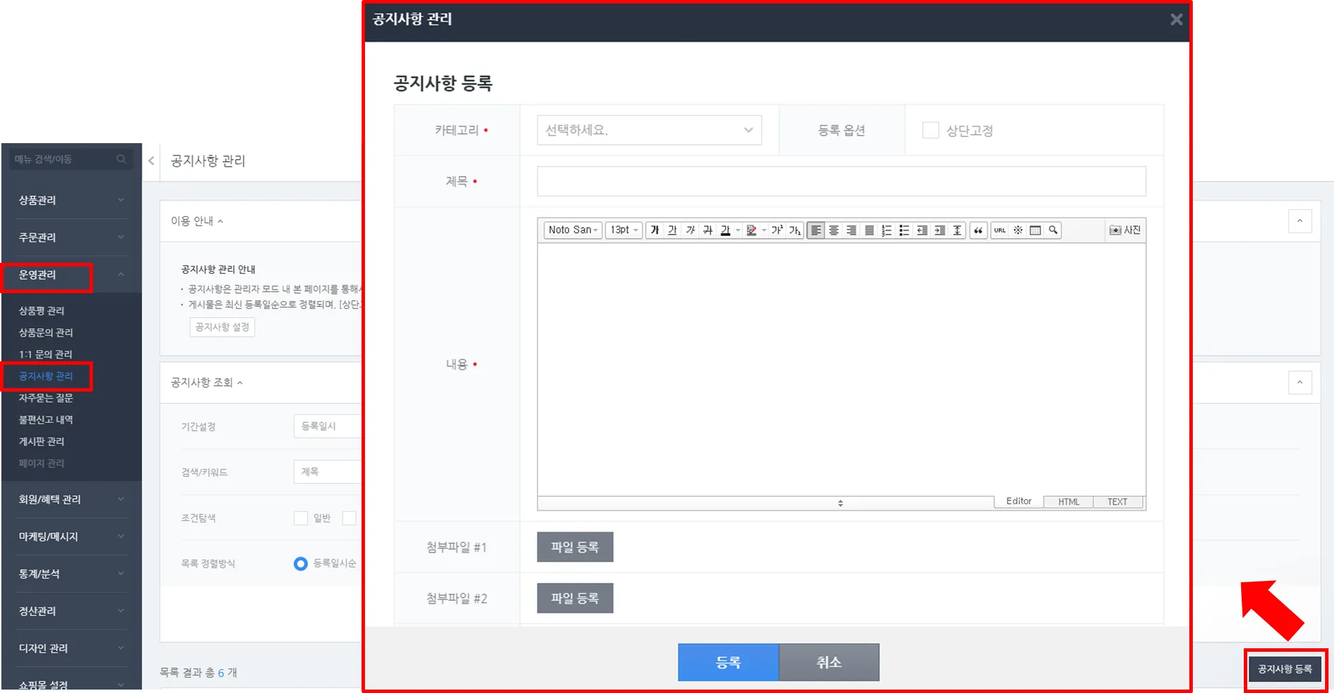 1) [운영관리 > 공지사항 관리] 메뉴에서 ‘공지사항 등록’ 버튼을 클릭합니다.