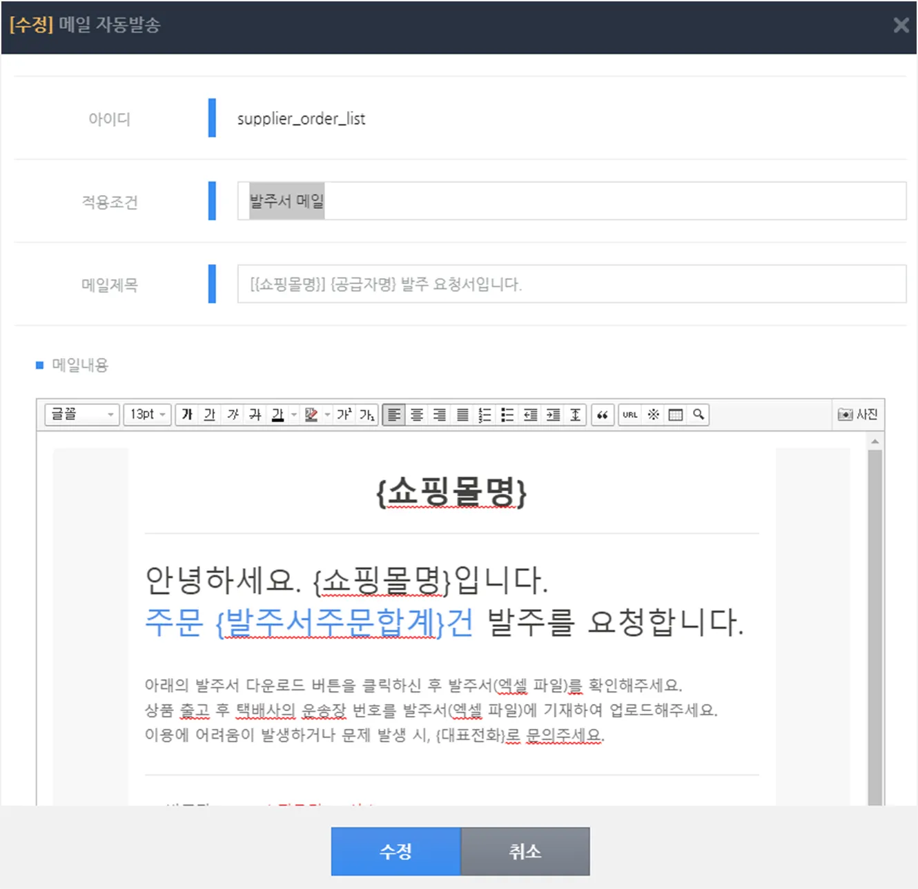 ② 발주메일 설정 : 메일 제목과 내용을 수정할 수 있습니다.
