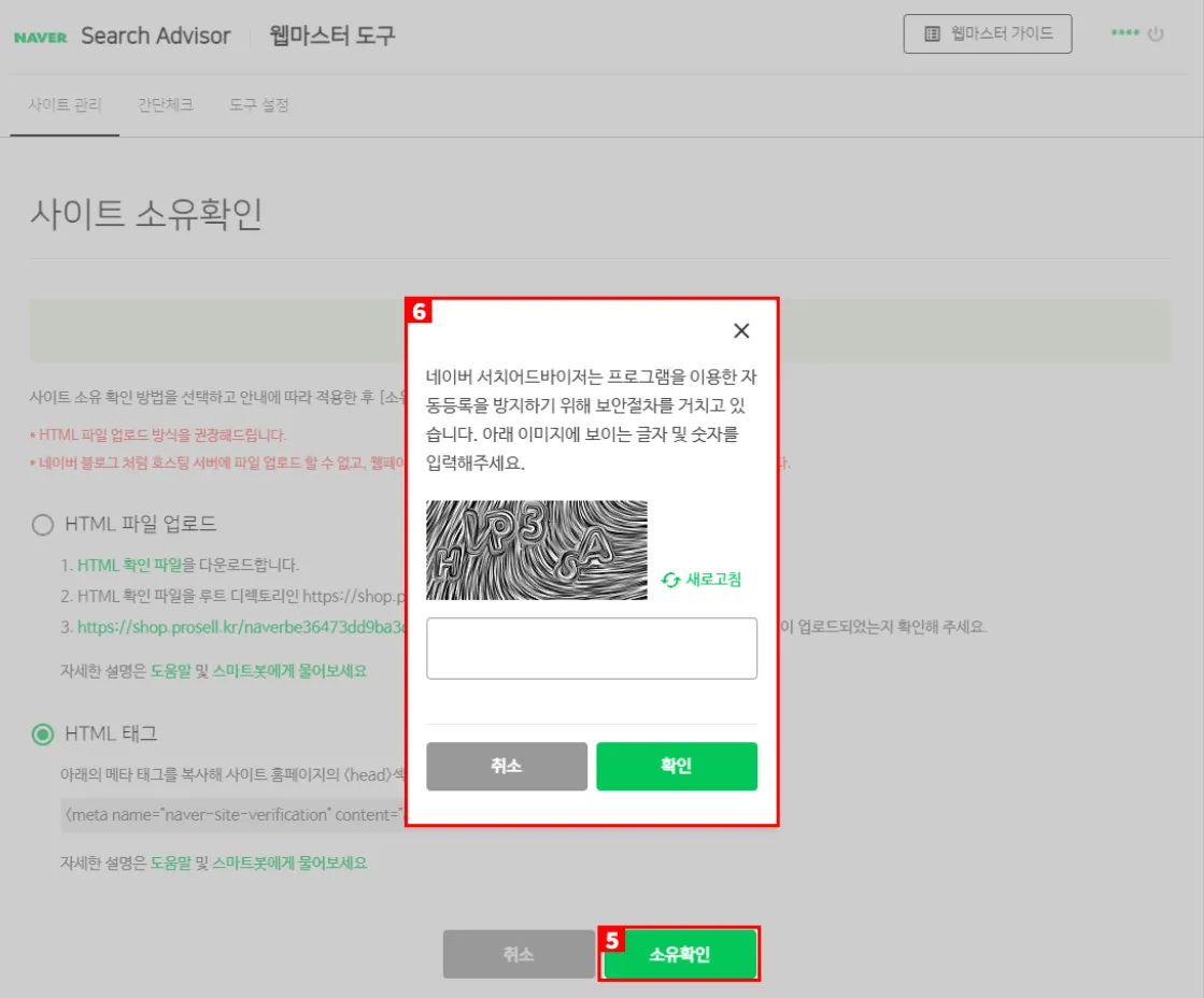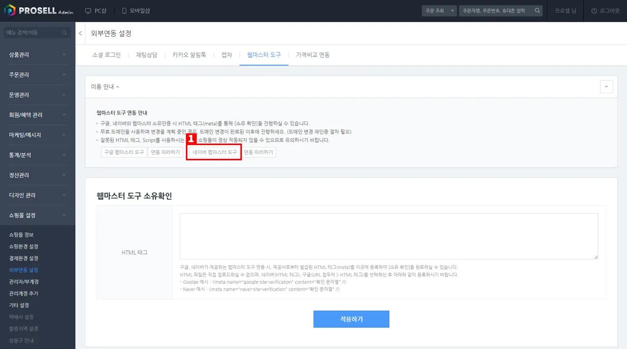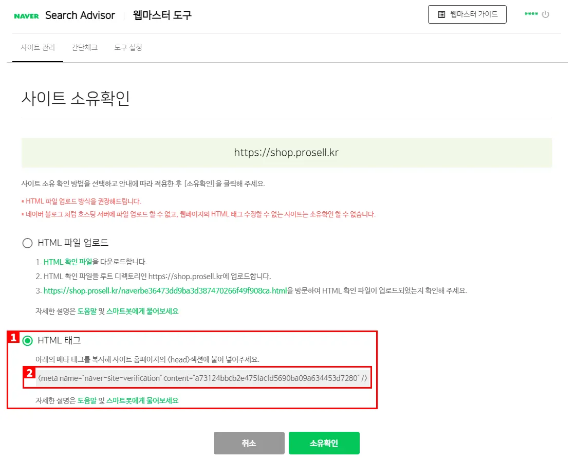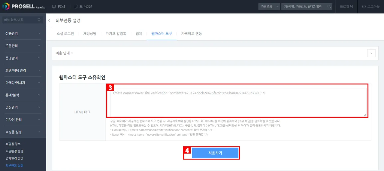 3) 복사한 메타 태그를 프로셀의 ‘웹마스터 도구 소유확인’ 항목에 붙여 넣습니다.