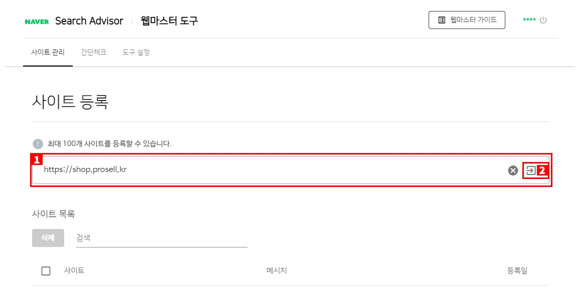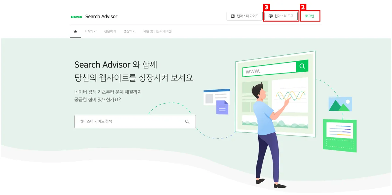3) 웹마스터 도구 버튼을 클릭하여 등록 페이지로 이동 합니다.