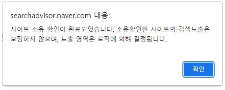 팝업창의 확인 버튼을 클릭하면 사이트 등록 및 소유확인이 완료 됩니다.