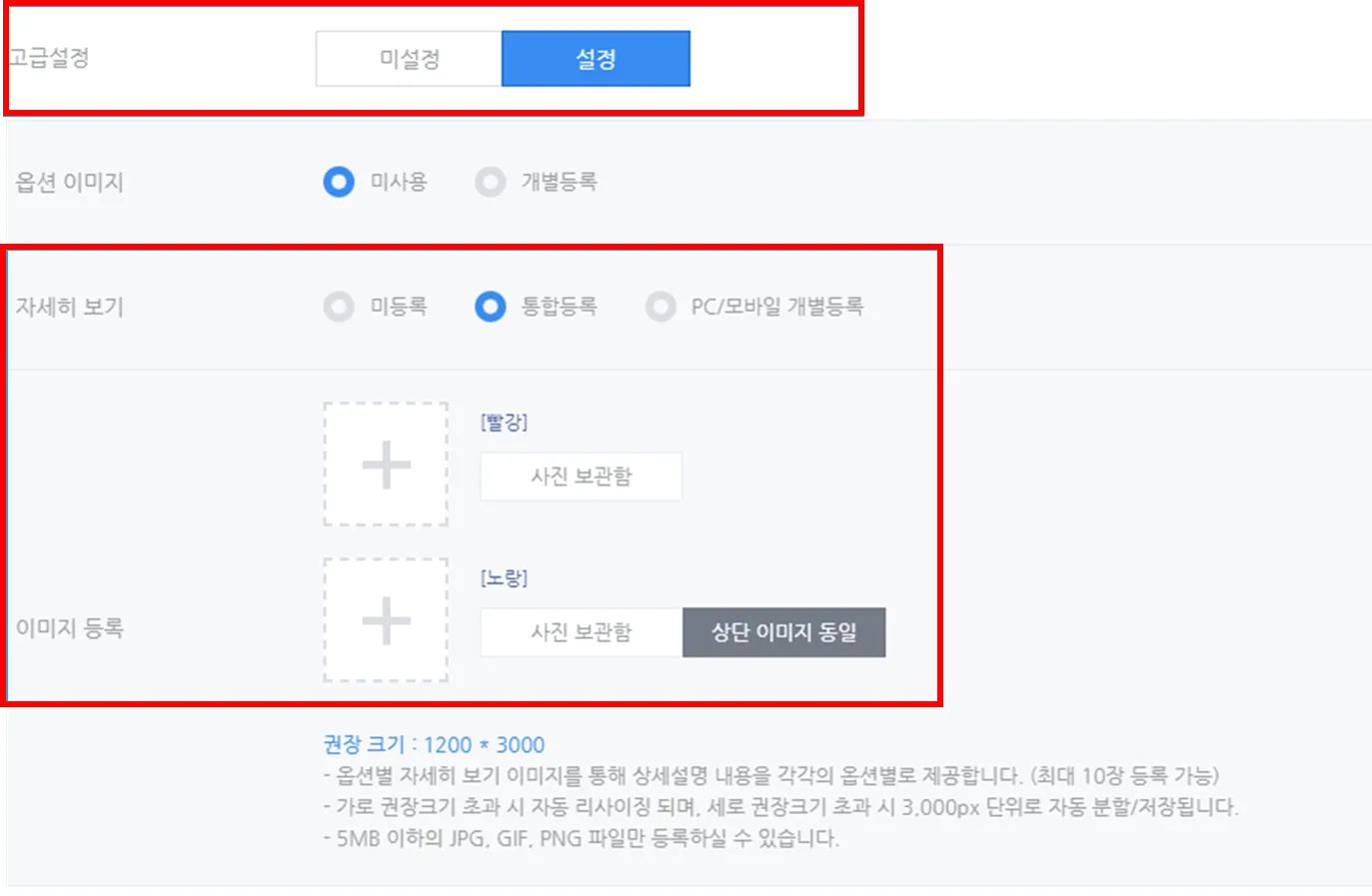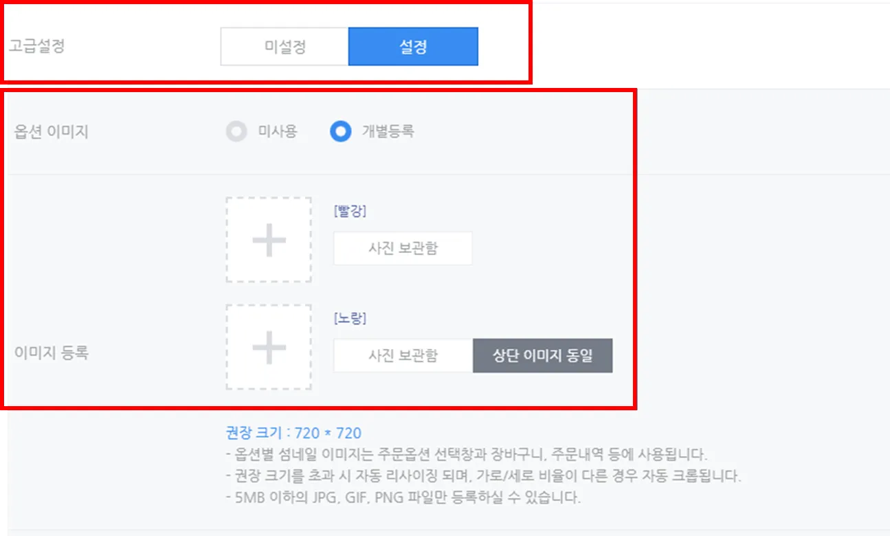 1) 상품등록 화면에서 ‘고급설정’ 기능을 설정으로 변경 후 옵션 이미지를 등록할 수 있습니다.