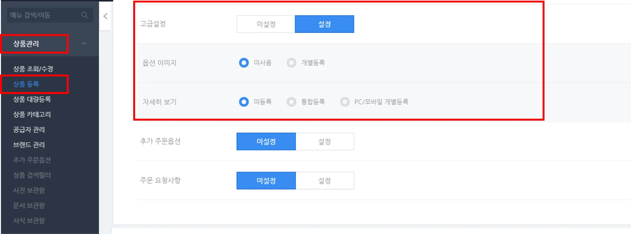 상품관리 > 상품등록 > ‘고급 설정’ 화면