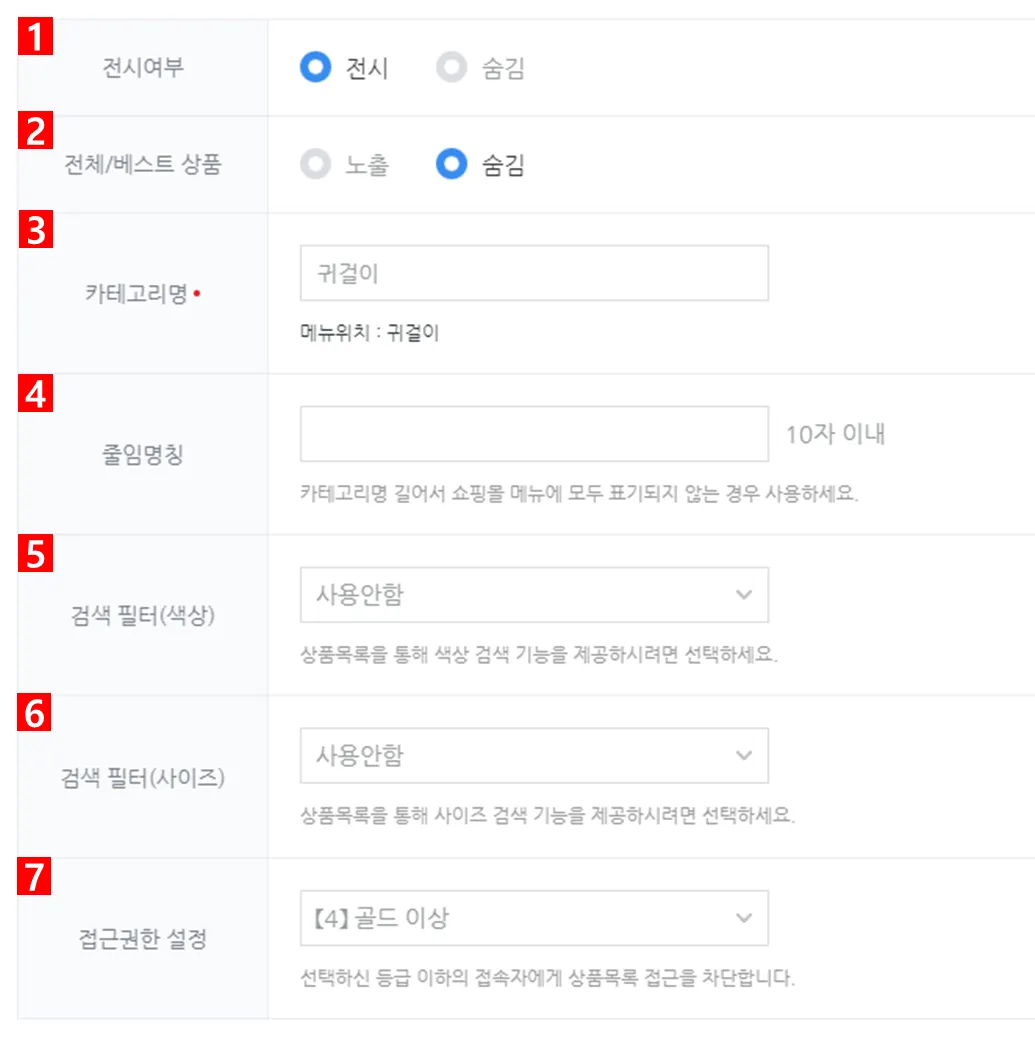 1) 전시여부 : 카테고리 노출/미노출 여부를 설정합니다.