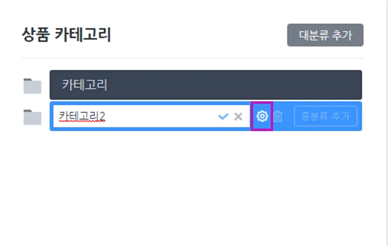 5) 카테고리 바에 표시된 [톱니바퀴] 아이콘을 클릭하면 카테고리의 명칭을 수정할 수 있고, 수정이 완료되면 키보드의 ‘ENTER’ 를 클릭하여 저장이 가능합니다.