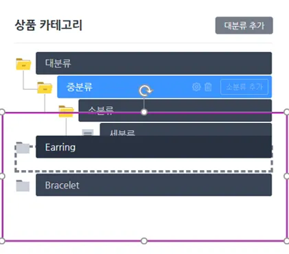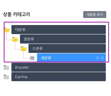 2) 대분류는 [대분류 추가] 버튼을 클릭하여 생성할 수 있으며, 중/소/세분류는 생성된 카테고리 바에 표기된 [분류 추가] 버튼을 클릭하여 생성합니다.