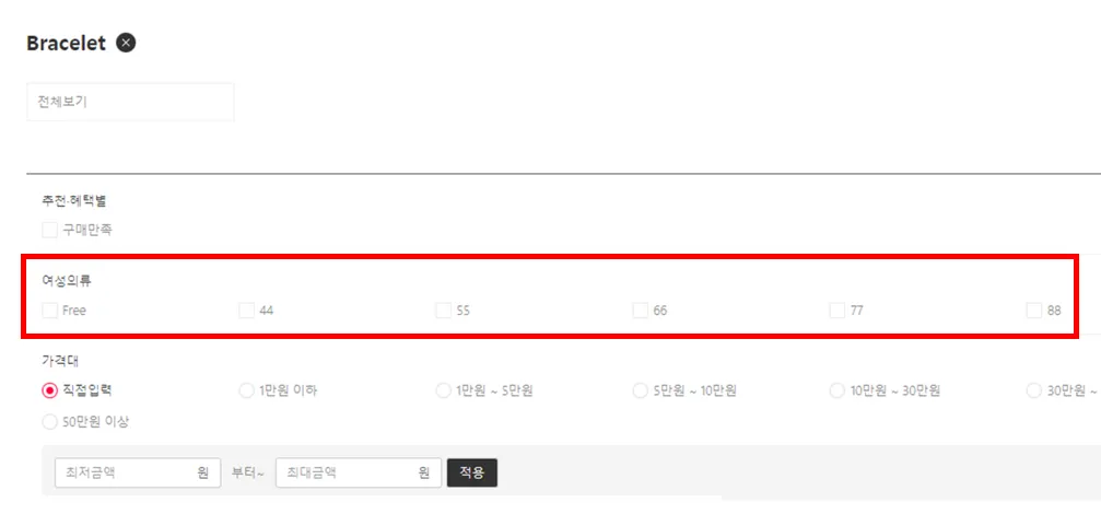 상품별로 필터(사이즈)를 등록한 상품만 검색이 가능합니다.