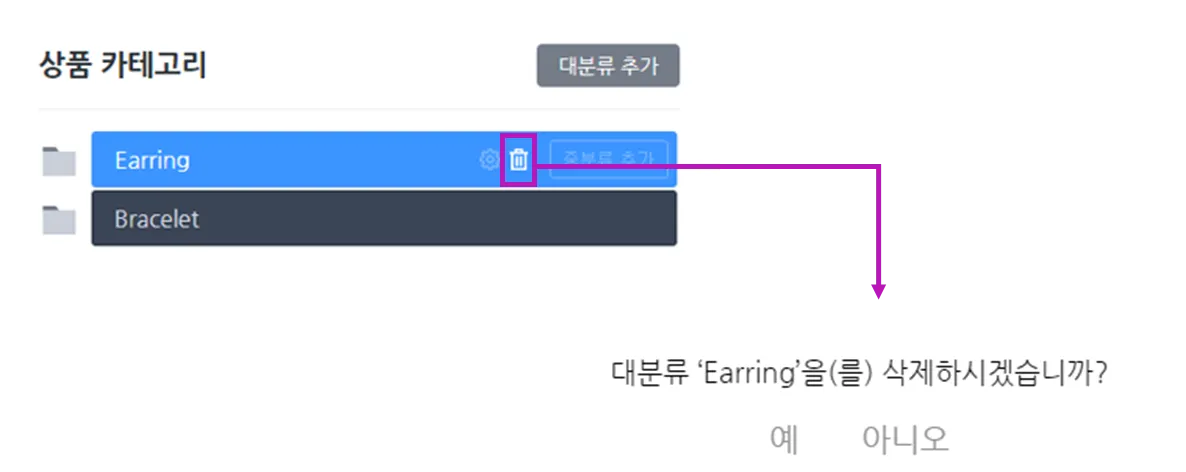 4) 카테고리 삭제는 카테고리 바에 표시된 [휴지통] 아이콘을 클릭하면 삭제가 가능합니다.