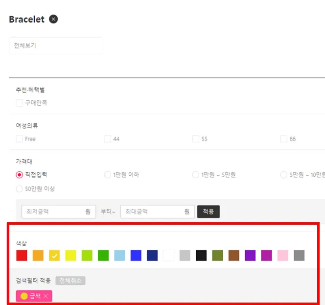 상품별로 필터(색상)를 등록한 상품만 검색이 가능합니다.
