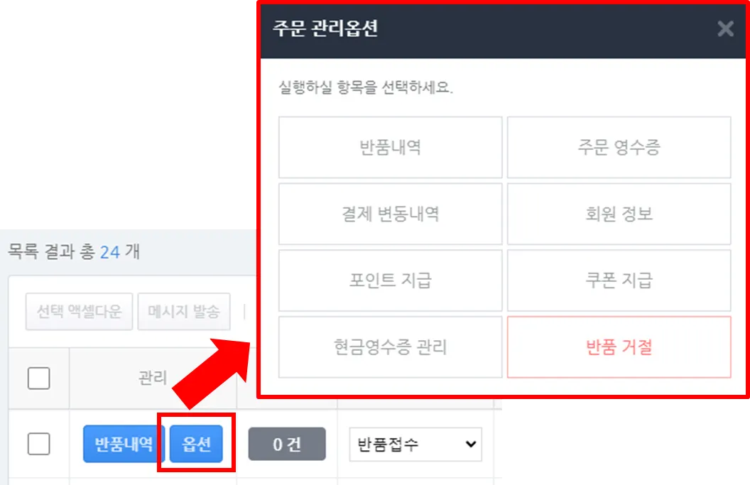 ‘반품내역’, ‘주문영수증’, ‘결제 변동내역’, ‘회원 정보’, ‘포인트 지급’, ‘쿠폰 지급’, ‘현금영수증 관리’, ‘반품거절’ 기능이 제공됩니다.