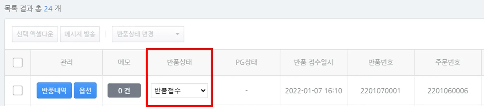 최초 반품접수 상태에서 반품중(회수중), 반품중(검수중), 반품완료 상태로 변경할 수 있습니다.