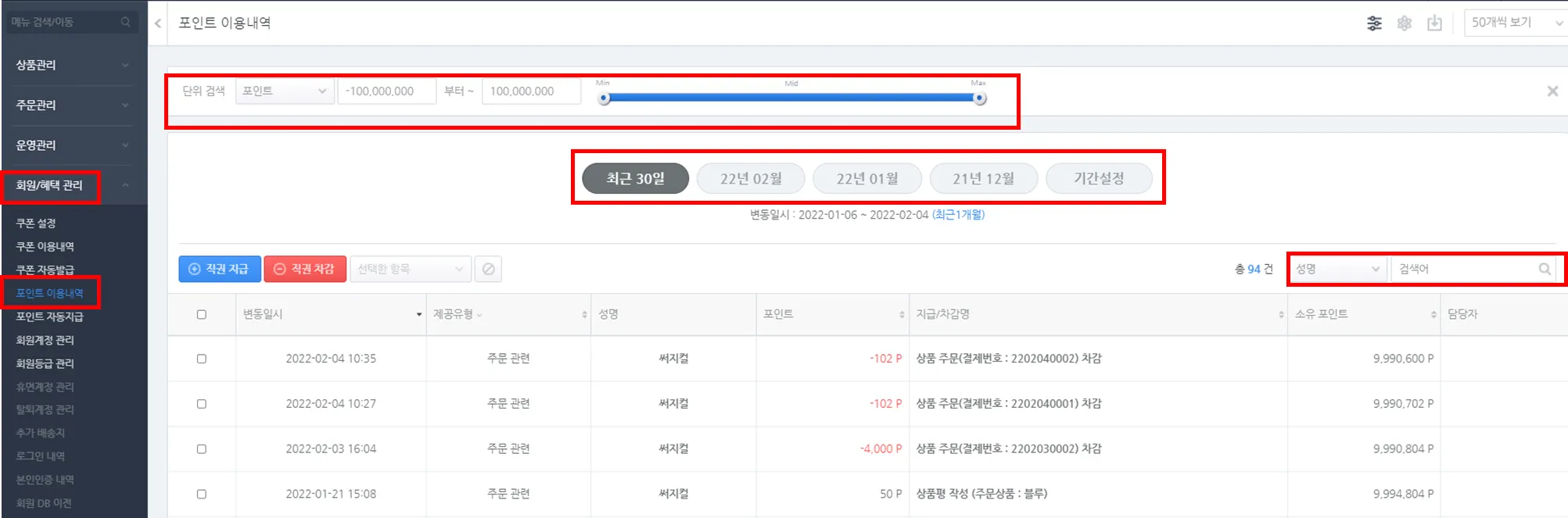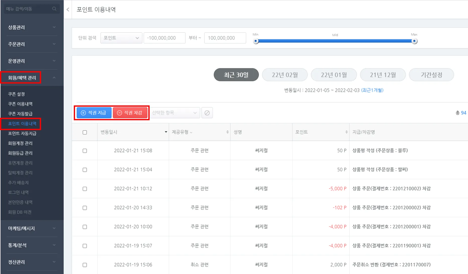 1) [회원/혜택관리 > 포인트 이용내역] 메뉴에서 지급/차감한 포인트의 상세 이용내역을 확인할 수 있습니다.