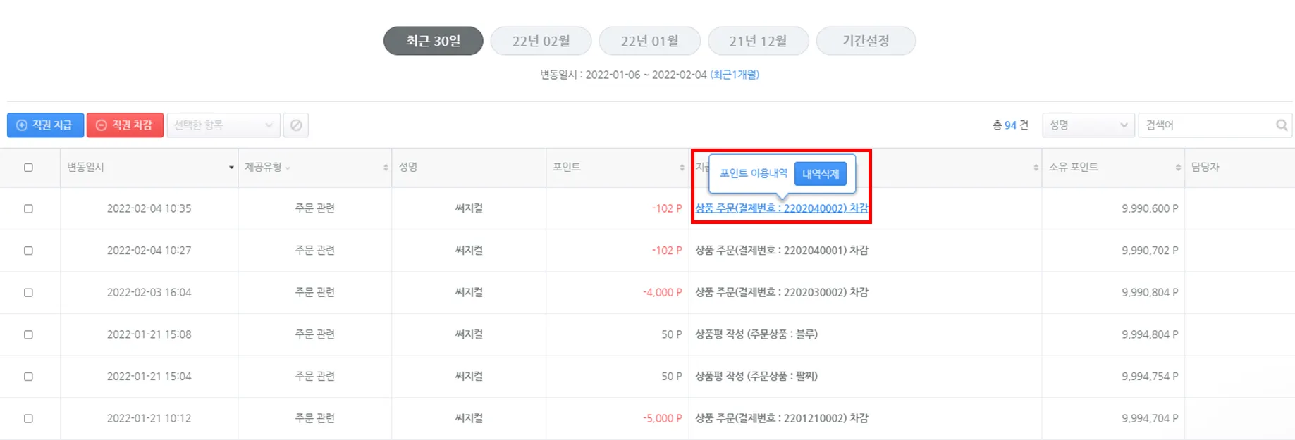 3) 포인트 이용내역에서 지급/차감명을 클릭하면 포인트 이용내역을 삭제할 수 있습니다.