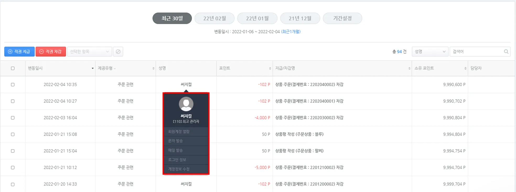 ※ 포인트 수동 지급/차감 및 이용내역을 조회 메뉴입니다.