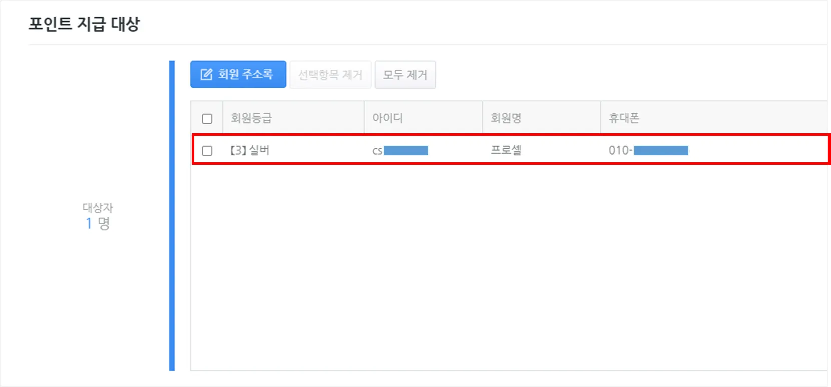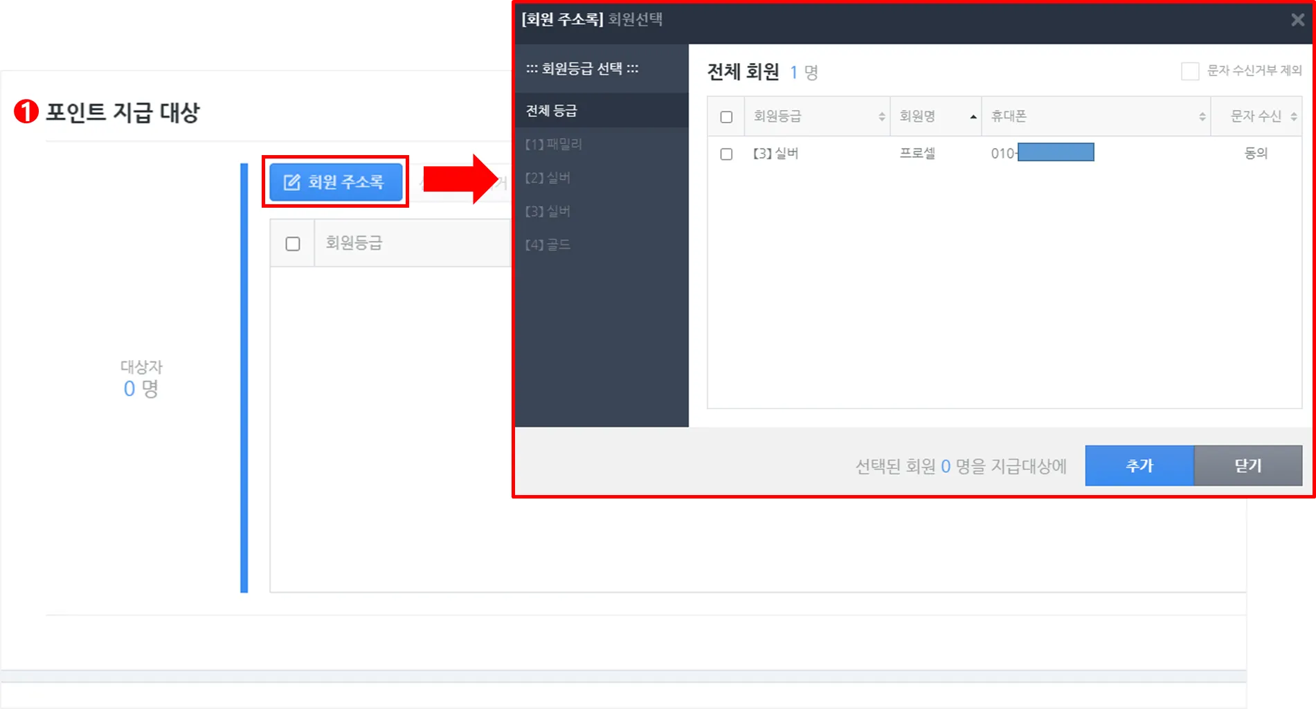 ‘회원 주소록’ 버튼을 클릭하면 회원 선택 팝업이 노출되고, 등급별로 회원을 선택하여 포인트 지급/차감 대상으로 지정할 수 있습니다.