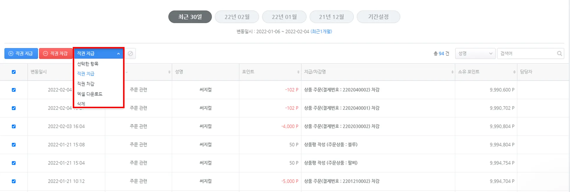 지급/차감명 : 포인트 지급/차감 사유를 입력합니다.