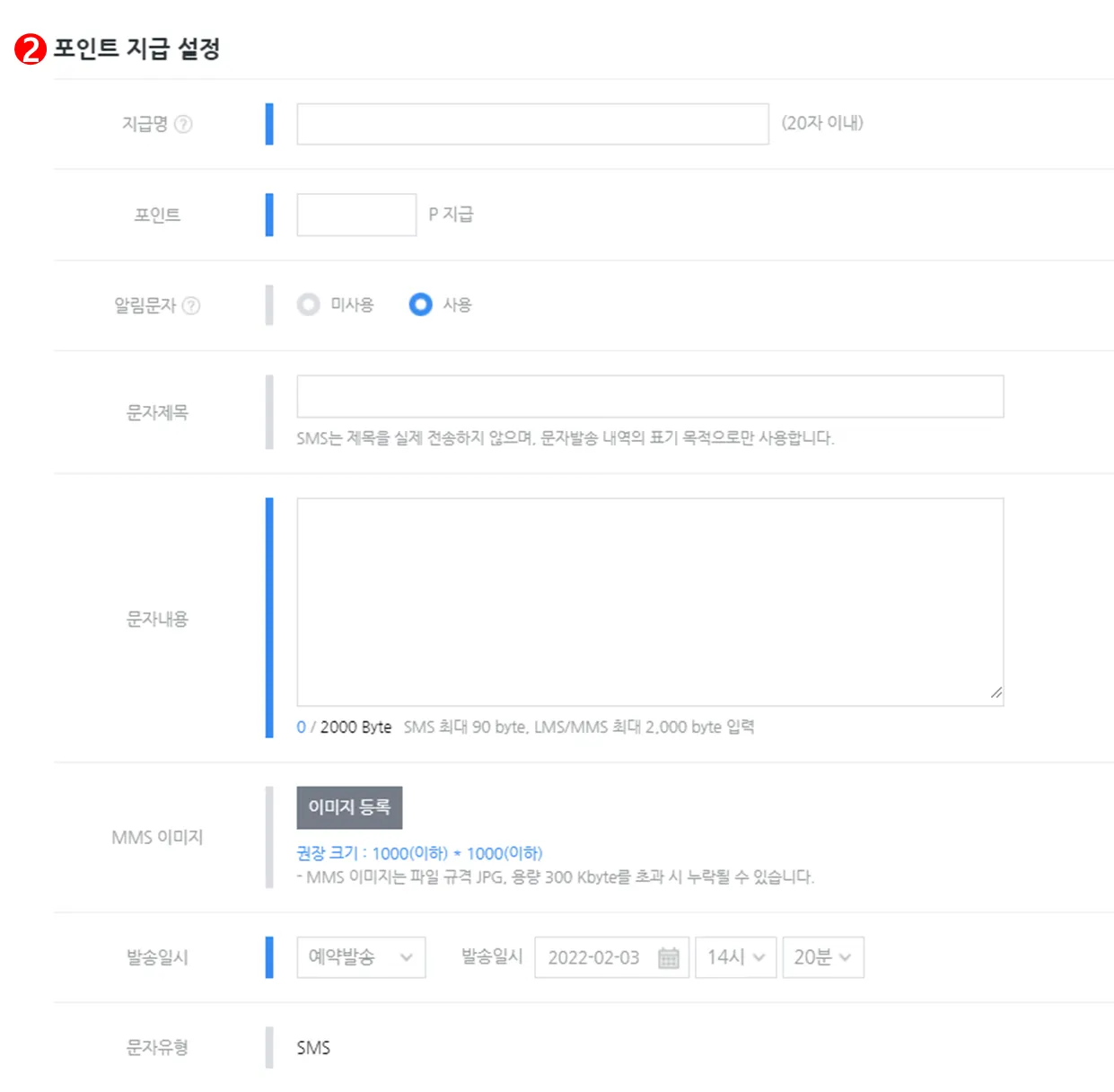 알림문자 : 포인트를 지급/차감하면서 동시에 문자 발송이 가능합니다.