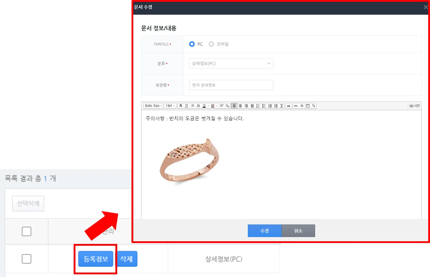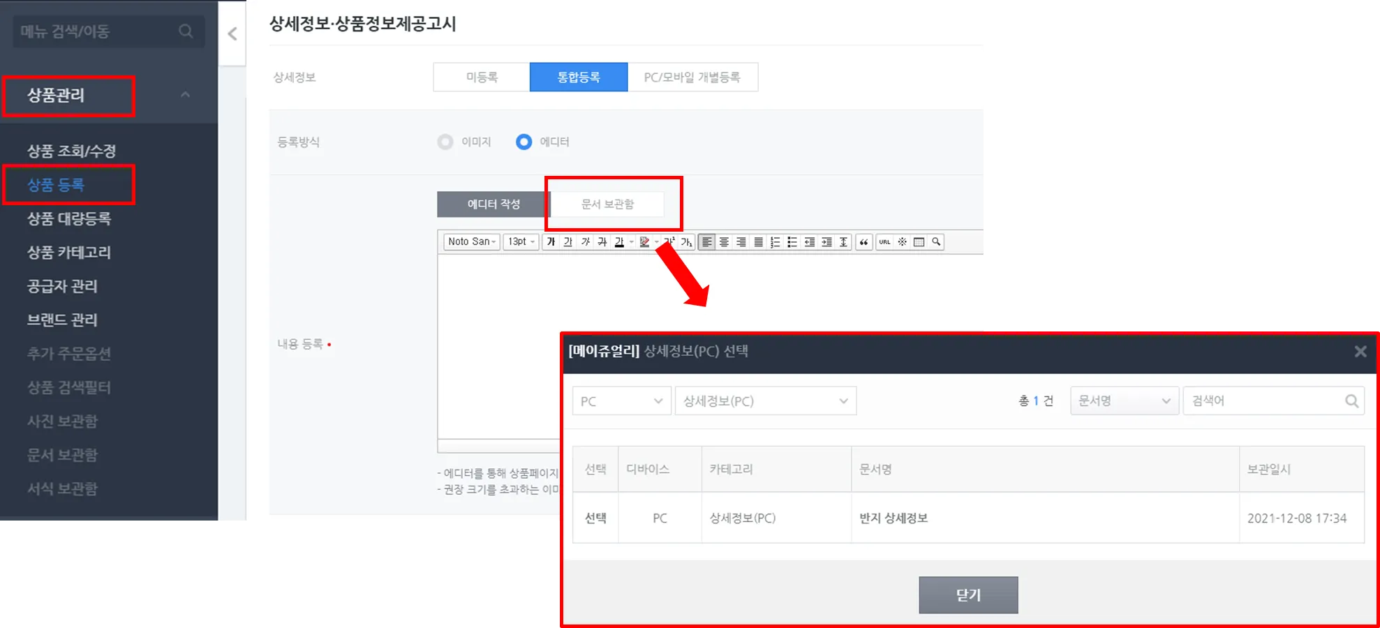 1) 상품 등록/수정 메뉴에서 에디터를 사용할 수 있는 모든 항목에 문서를 불러올 수 있습니다.